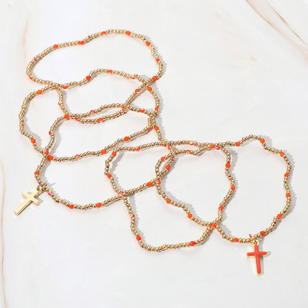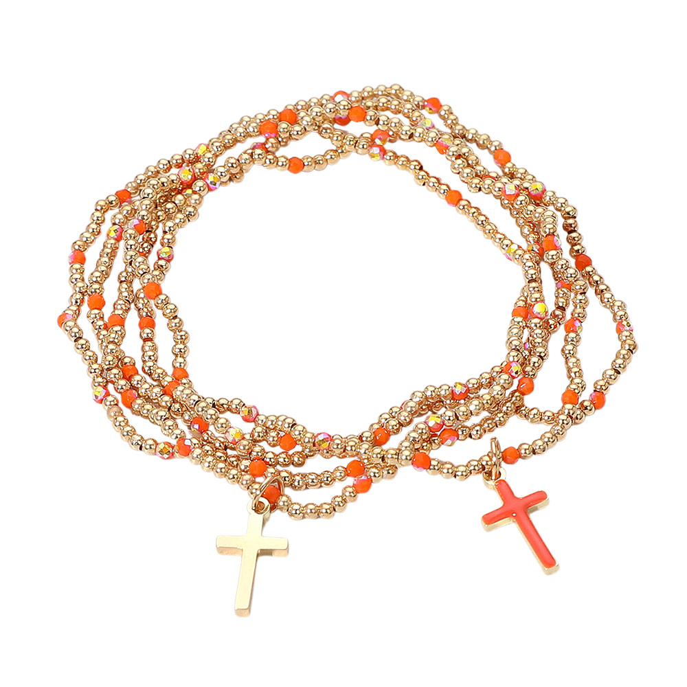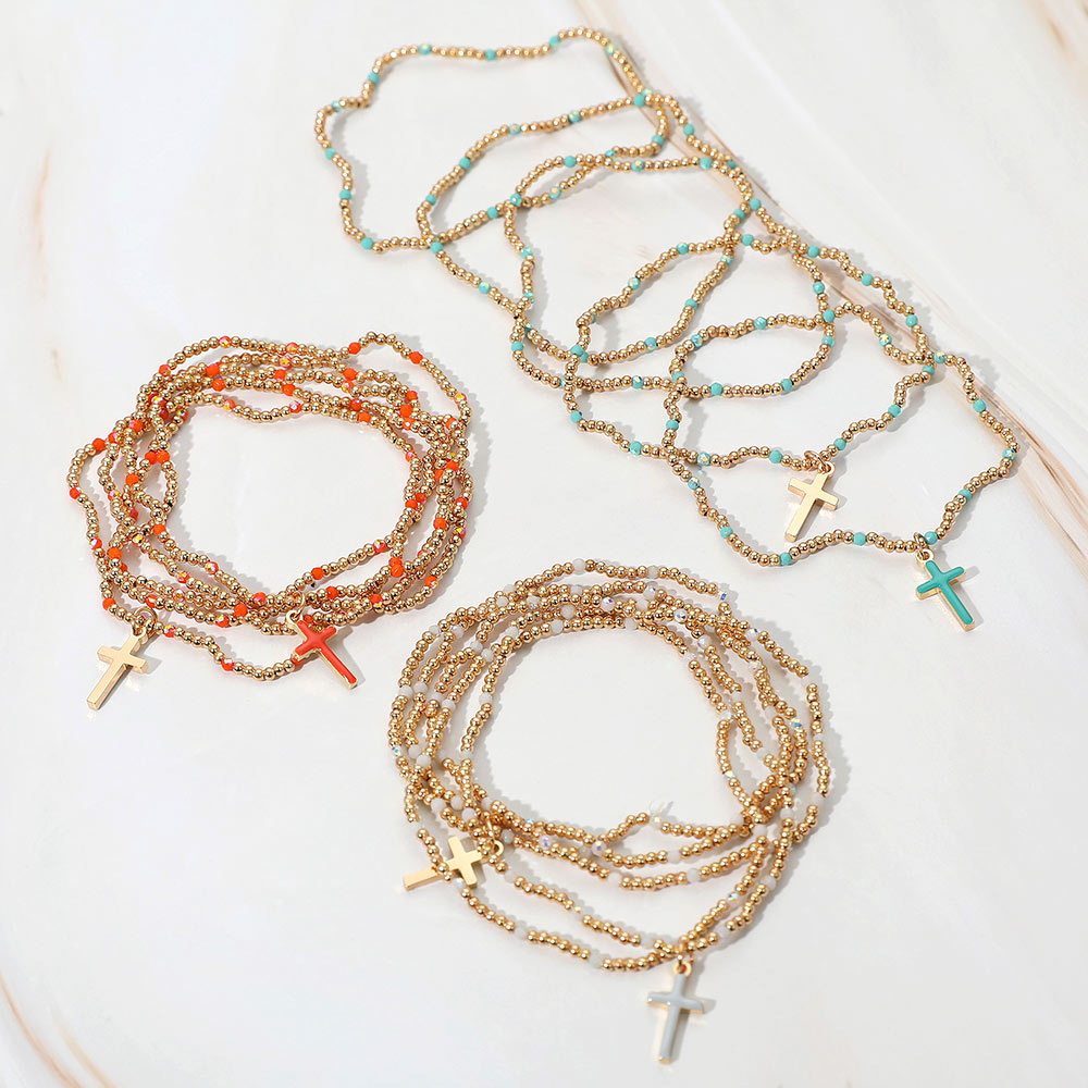 Details • Size : 0.5" H • Charm Size : 0.3" X 0.75" • Stretchable • Multi-strand beaded bracelet set designed with delicate beads and cross charms for a meaningful accent. Lightweight and comfortable with stretch fit, this layered bracelet set blends fashion with symbolism, making it perfect for everyday wear, gifting, or stacking with other jewelry pieces. • Lead and Nickel Compliant