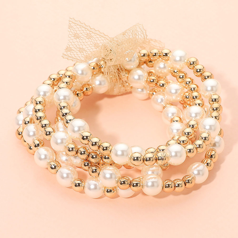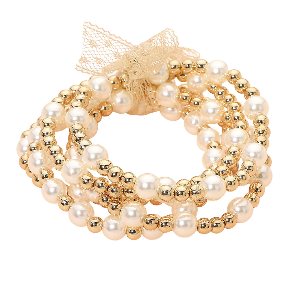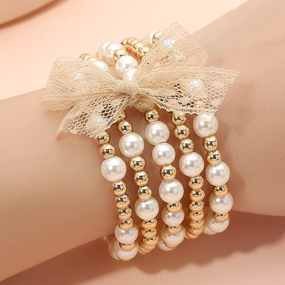 5PCS - Elegant PEarl Metal Ball Beaded Stretch Multi Layered Bracelets