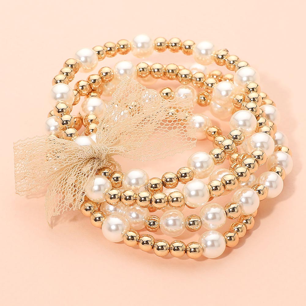 • This layered pearl bead bracelet set adds a refined, feminine touch to any look. Designed with multiple strands and a delicate bow accent, it brings timeless charm and subtle sophistication, making it a perfect styling piece for both everyday wear and special occasions.