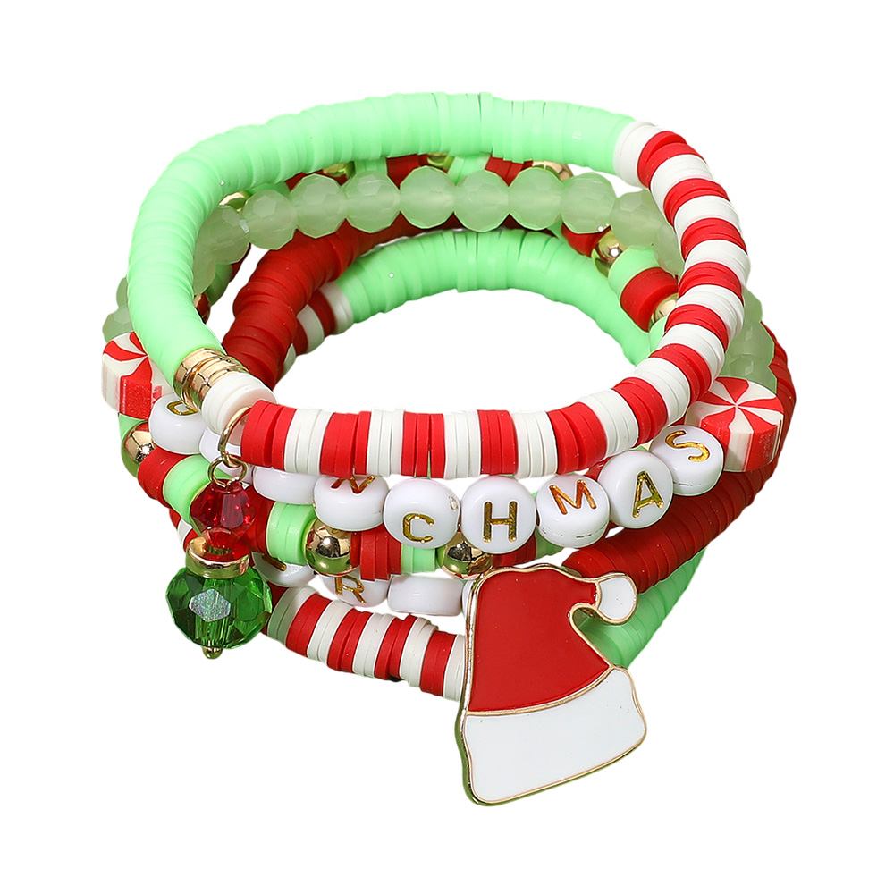 Details • Size : 1.75" H • Stretchable • Celebrate the season with this Christmas coil bracelet set featuring playful letter beads, candy stripe accents, festive charms, and holiday-inspired details. Perfect accessory for parties, gifting, or spreading cheerful style during celebrations. • Lead and Nickel Compliant