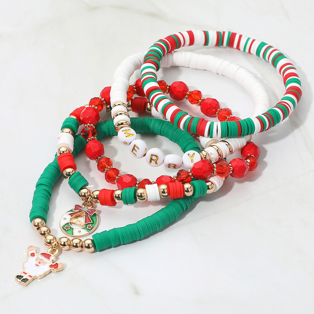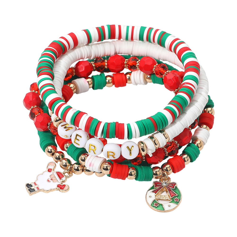 5PCS - MERRY Message Santa Mitten Wreath Charm Heishi Faceted Beaded Stretch Multi Layered Bracelets