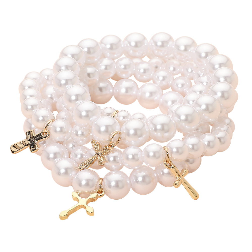 Details • Size : 1.8" H • Charm Size : 0.5" X 0.7" • Stretchable • This multi-strand stretch bracelet features glossy pearl-inspired beads paired with delicate cross charms for a refined, meaningful touch. Its layered, graceful design adds sophistication to any look, making it a beautiful accessory for both everyday wear and special occasions. • Lead and Nickel Compliant