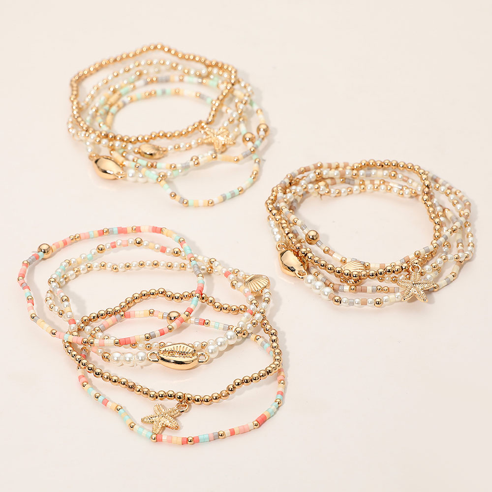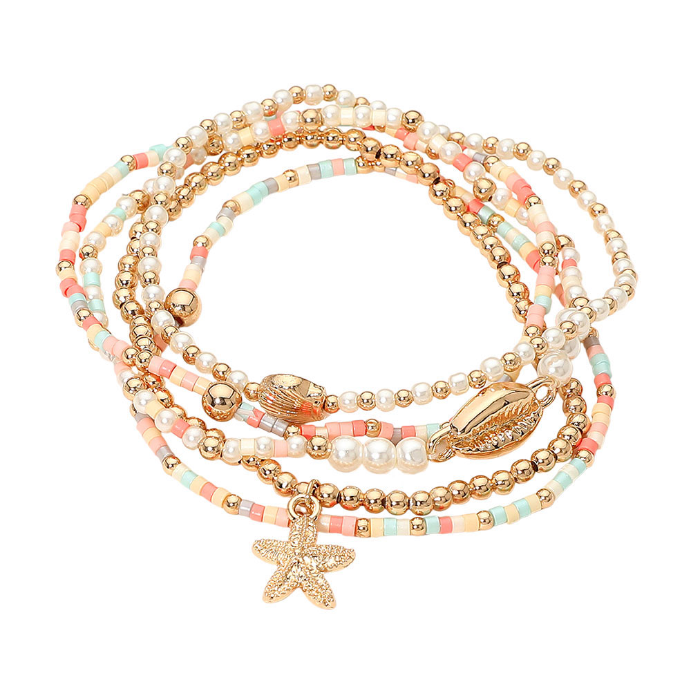 5PCS - Starfish Seashell Charm Pearl Seed Beaded Stretch Multi Layered Bracelets