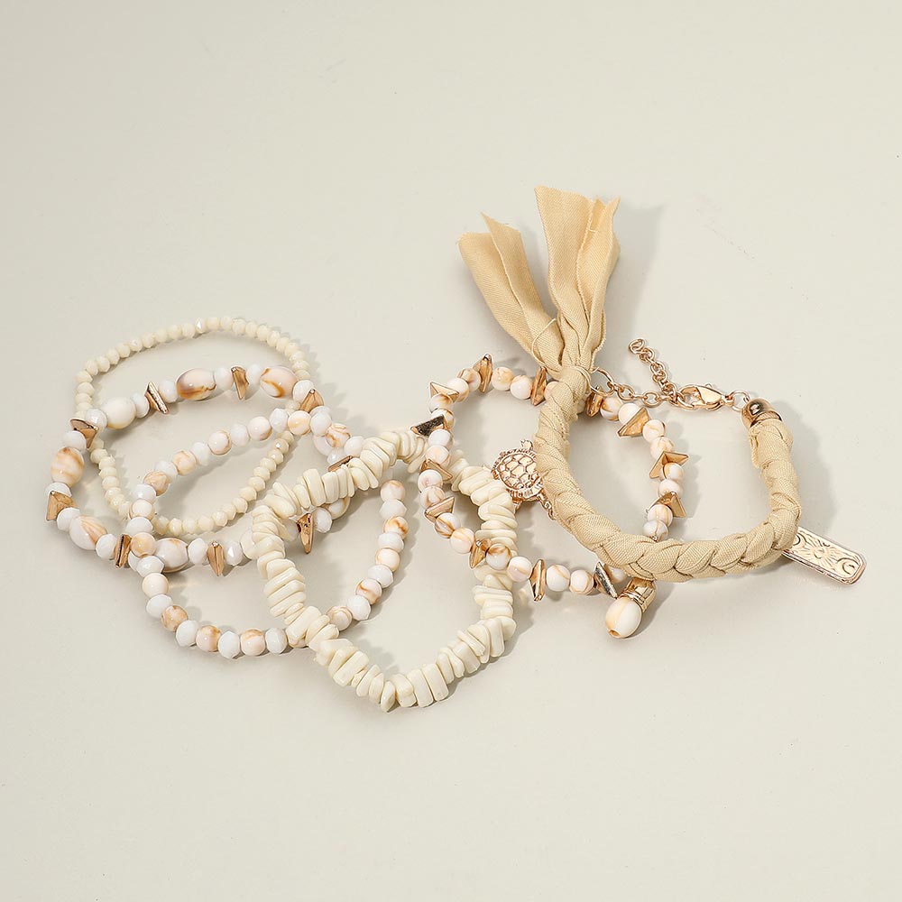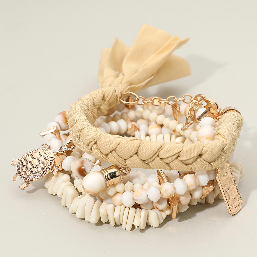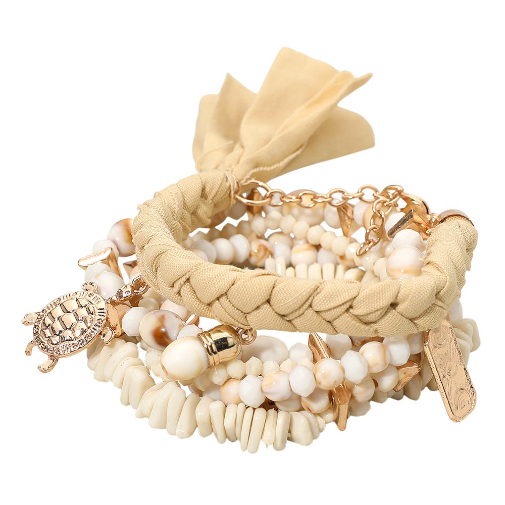 Details • Size 1 : 1.5" H / Stretchable • Size 2 : 0.4" H, 7" + 2" L / Lobster Clasp Closure • Embrace coastal style with this 6-piece boho beach bracelet set featuring layered beads, braided details, and a charming turtle pendant. Mix-and-match designs create endless styling options, from casual day looks to vacation nights. Stretch and adjustable pieces ensure a comfortable fit, making it an easy accessory for any outfit. • Lead and Nickel Compliant • Made In India