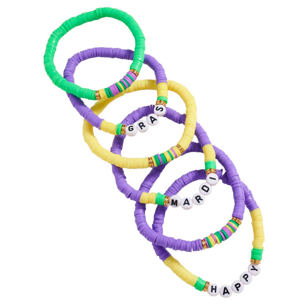 Details • Size : 1.5" H • Stretchable • This Mardi Gras beaded stretch bracelet set features festive letter accents and playful round beads for a lively, celebratory look. Perfect for parties, parades, or casual fun, these easy-to-wear bracelets bring cheerful charm and vibrant personality to any ensemble. • Lead and Nickel Compliant