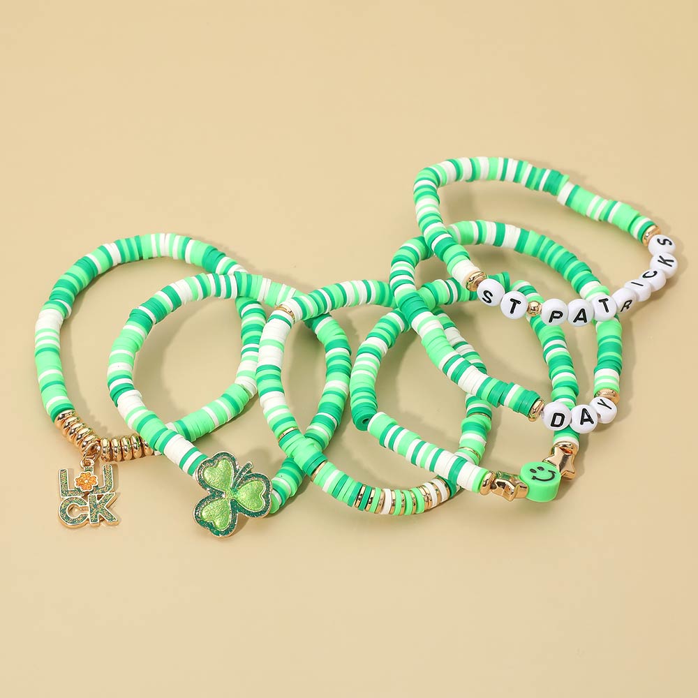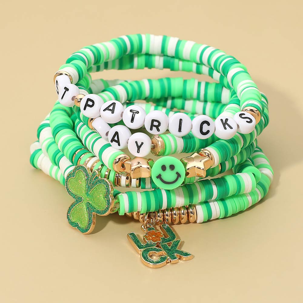 Details • Size : 2.25" H • Stretchable • Festive stretch bracelet set designed for St. Patrick’s Day featuring lucky-themed charms, playful letter beads, and stackable styling. Easy to wear and perfect for gifting, party favors, seasonal displays, parades, and boutique assortments that celebrate Irish-inspired fun and cheerful holiday accessorizing. • Lead and Nickel Compliant