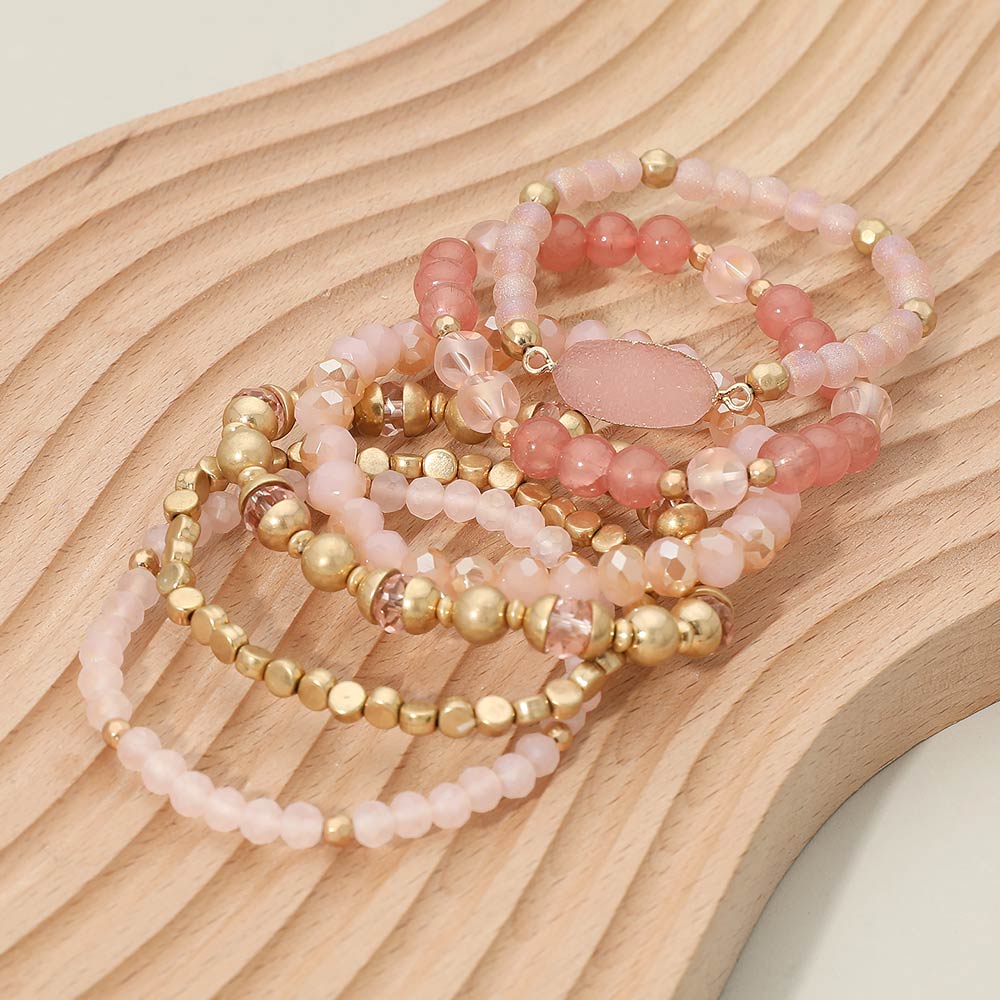 6PCS - Oval Druzy Charm Accent Faceted Beaded Stretch Multi Layered Bracelets