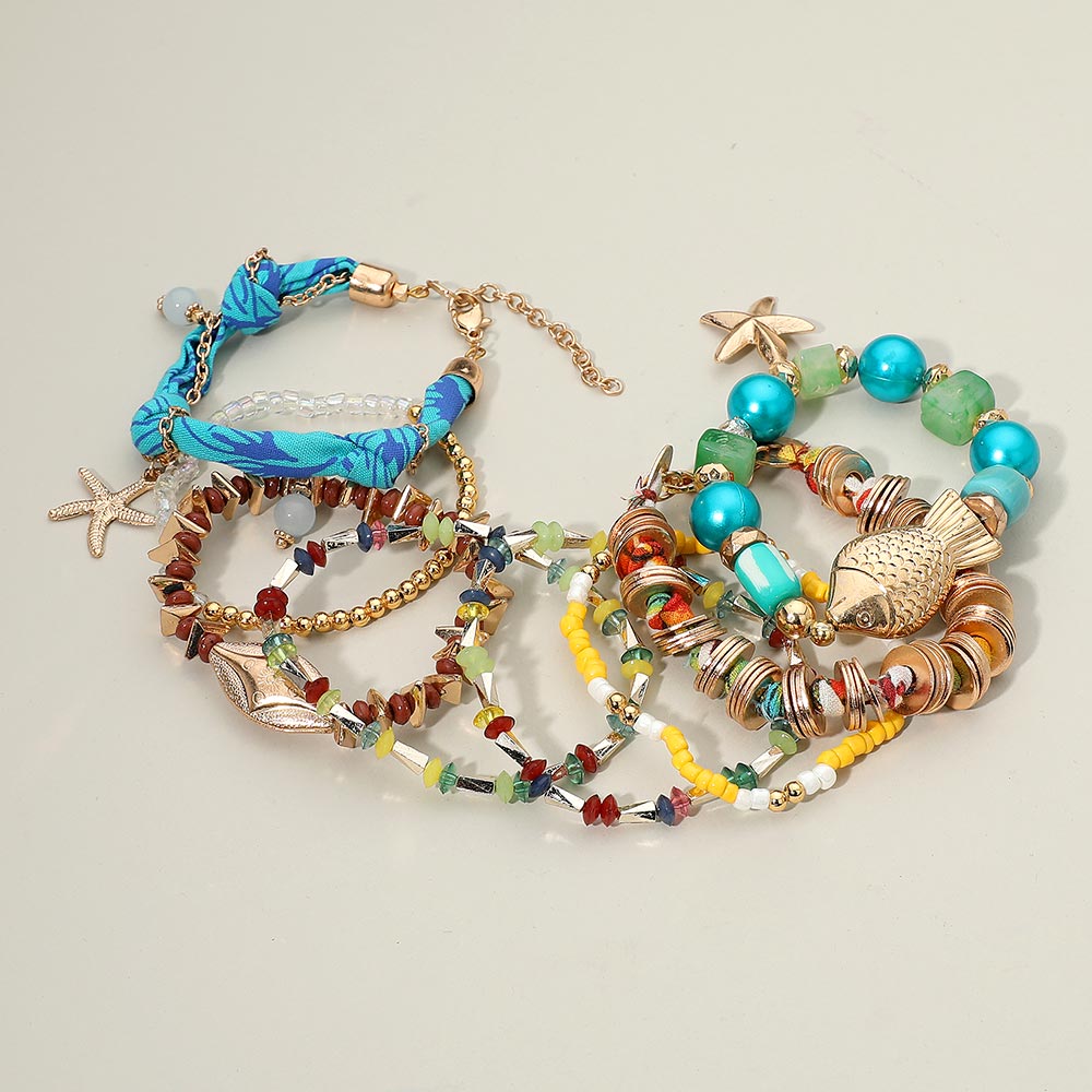 Details • Size 1 : 1.5" H / Stretchable • Size 2 : 0.5" H, 8" L / Lobster Clasp Closure • Size 3 : 0.5" H, 8" + 2" L / Lobster Clasp Closure • Discover a vibrant boho bracelet set featuring layered beads, patterned fabric details, and coastal-inspired charms. This playful stack offers standout texture and artistic appeal, perfect for adding a unique, free-spirited touch to everyday looks or beach-ready styles. • Lead and Nickel Compliant • Made In India