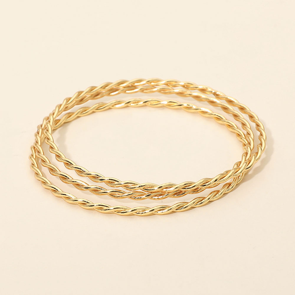 Details • Size : 0.4" H, 2.6" D • Water Resistant • Elegant twisted rope stackable bangle set featuring a timeless circular design that adds texture and movement to wrist styling. Ideal for layering or wearing solo, this versatile bangle set complements casual outfits, office looks, and evening wear with effortless, modern appeal. • Hypoallergenic • Stainless Steel