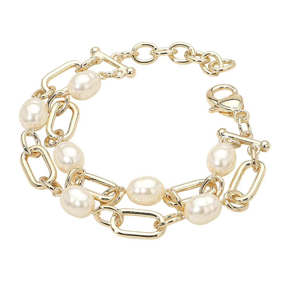 Details • Size : 0.75" H, 7.5" + 1.75" L • Lobster Clasp Closure • This bracelet features a bold chain design with pearl decorative details and an adjustable clasp for a secure fit. Perfect for everyday wear, gifting, or special occasions, this versatile accessory complements casual and dressy styles while offering comfortable, easy styling. • Gold Dipped