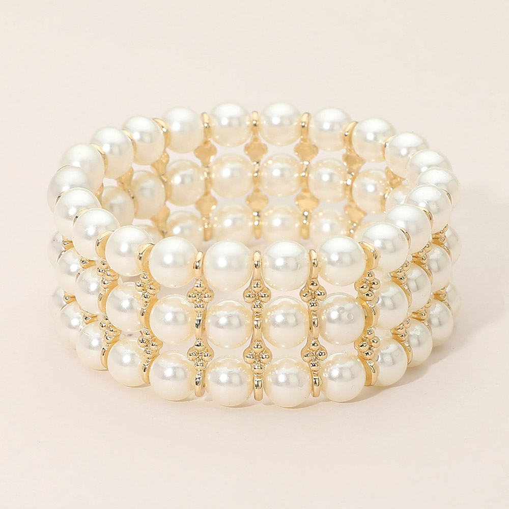 Details • Size : 1" H • Stretchable • Elegant stretch bracelet designed with layered round pearl-style beads and refined spacer accents for a timeless, polished look. The flexible slip-on fit offers comfort and easy wear, making it perfect for everyday styling, special occasions, or stacking with other bracelets. A versatile accessory that adds effortless sophistication to any outfit. • Lead and Nickel Compliant