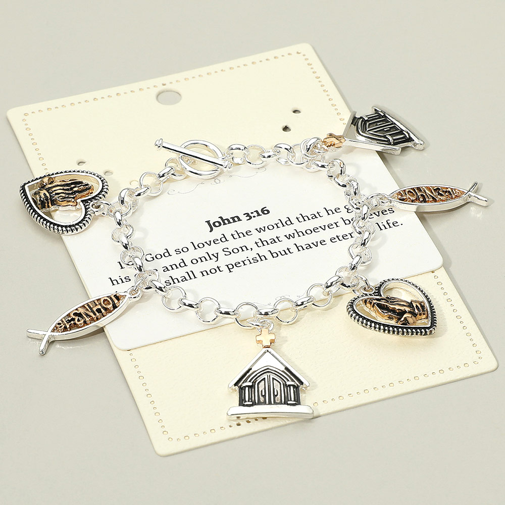 Details • Size : 1.25" H, 7.5" L • Toggle Closure • Celebrate faith and devotion with this John 3:16 charm bracelet, featuring meaningful charms including a church, heart, and faith fish. Designed to inspire and uplift, this bracelet is a beautiful expression of belief and a thoughtful gift for anyone cherishing spiritual love. • Lead and Nickel Compliant