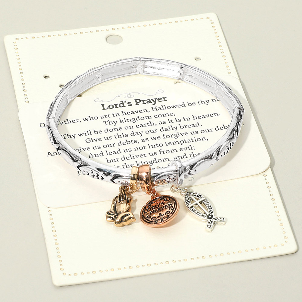Details • Size : 0.25" H • Charm Size : 1" L • Stretchable • Elegant Lord’s Prayer charm bracelet featuring praying hands, an inscribed medallion, and a symbolic fish charm. A meaningful accessory designed to inspire faith and devotion, perfect for daily wear or gifting. • Lead and Nickel Compliant