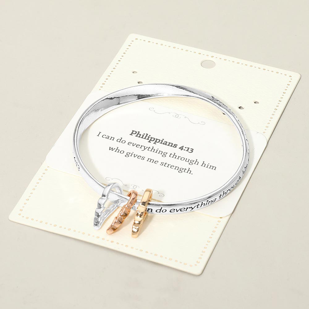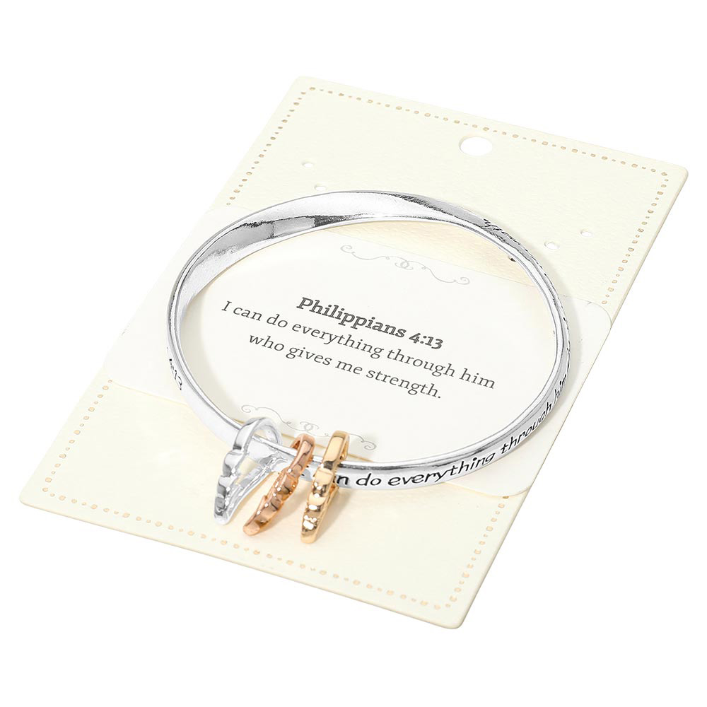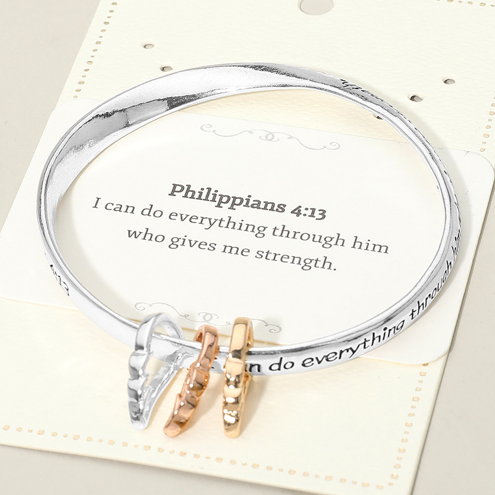 • Stay inspired with this Philippians 4:13 engraved scripture bangle bracelet featuring a meaningful message and delicate accent charms. Perfect for daily wear, faith-centered gifting, or special occasions, it offers a stylish way to carry strength, hope, and encouragement wherever you go.