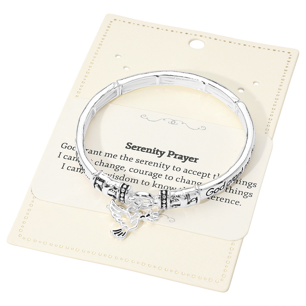 Details • Size : 0.25" H, 2.4" D • Charm Size : 0.6" L • Stretchable • Embrace peace and faith with this elegant bangle bracelet featuring the Serenity Prayer and a symbolic dove charm. Designed to inspire calm and courage, it serves as a daily reminder of wisdom and inner strength, making it a meaningful gift or personal keepsake for spiritual reflection. • Lead and Nickel Compliant