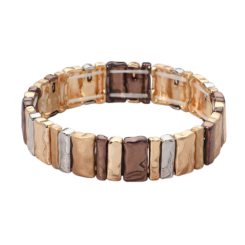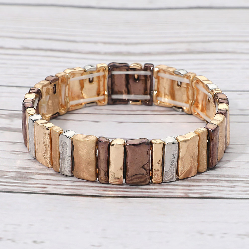 • Chunky stretch bracelet with distressed rectangular links in rustic finishes. A bold, artisan-inspired design ideal for adding a touch of vintage edge to casual and boho outfits. Comfortable and easy to wear.
