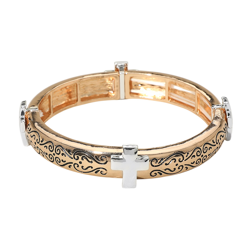 Details • Size : 0.6" H • Stretchable • Elegant hinged bangle bracelet featuring engraved swirl detailing and cross accents for a timeless, faith-inspired look. Designed for easy wear and a secure fit, this bracelet is ideal for everyday styling, gifting, and boutique jewelry collections. • Lead and Nickel Compliant