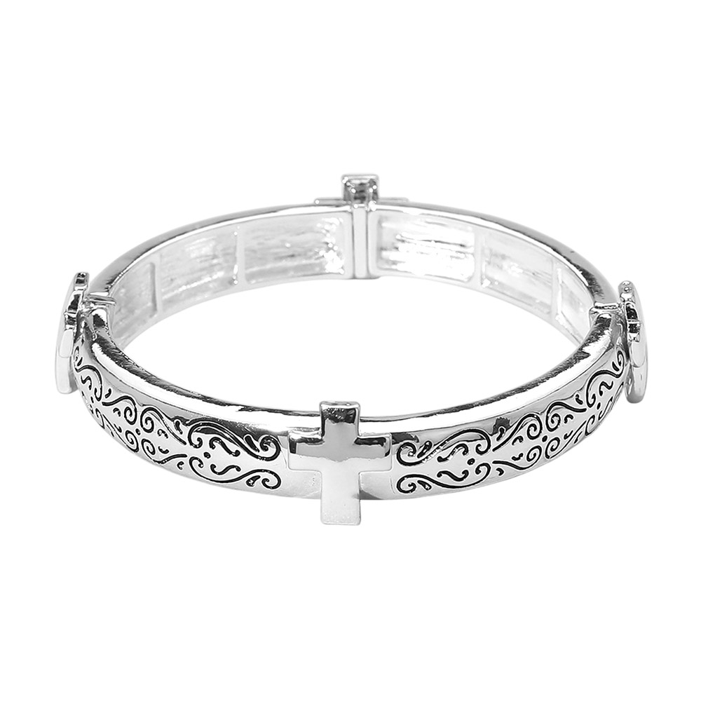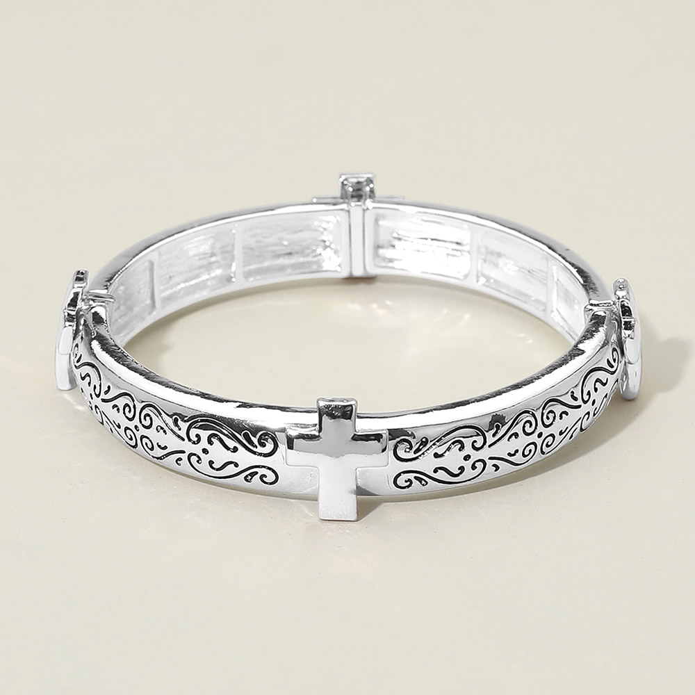 Details • Size : 0.6" H • Stretchable • Elegant hinged bangle bracelet featuring engraved swirl detailing and cross accents for a timeless, faith-inspired look. Designed for easy wear and a secure fit, this bracelet is ideal for everyday styling, gifting, and boutique jewelry collections. • Lead and Nickel Compliant