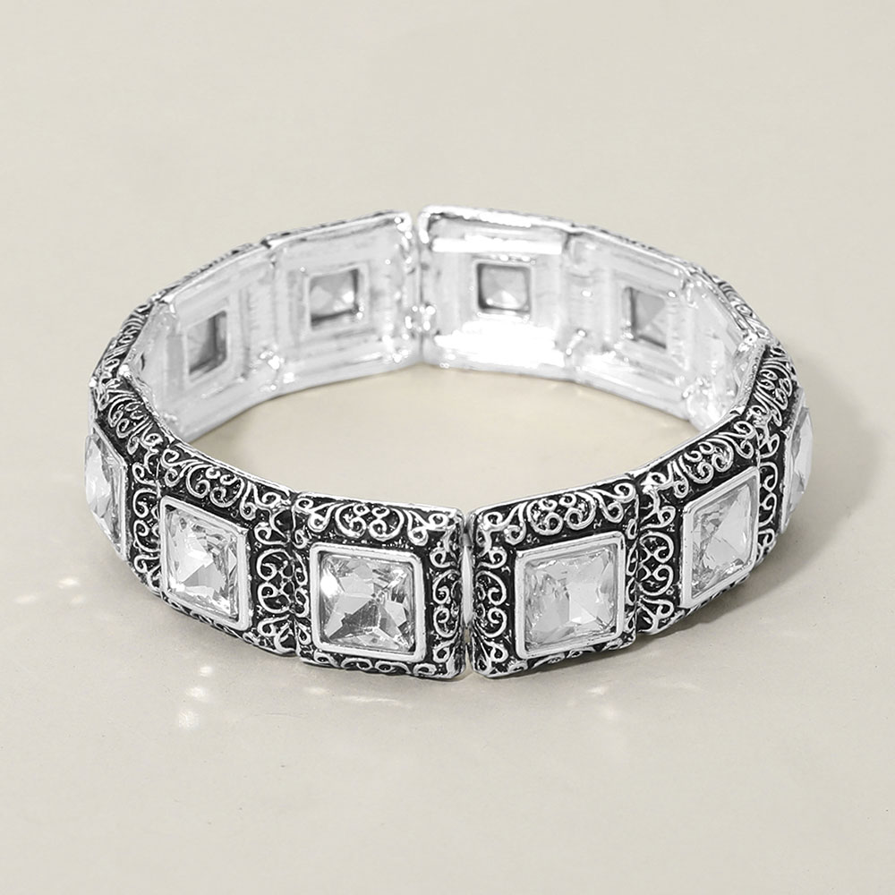 Antique Metal Scrollwork Frame Square Tile Beaded Stretch Bracelet