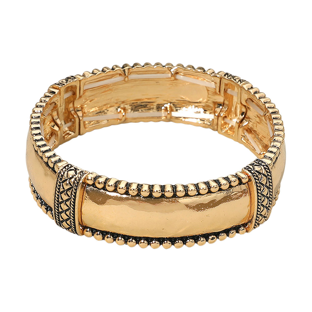 Details • Size : 0.75" H, 2.3" D • Stretchable • This statement bangle showcases a bold, smooth surface framed with intricate beaded edges and detailed accents for a refined finish. Its timeless design and artistic texture create an elegant, eye-catching piece that complements both modern and classic fashion styles effortlessly. • Lead and Nickel Compliant