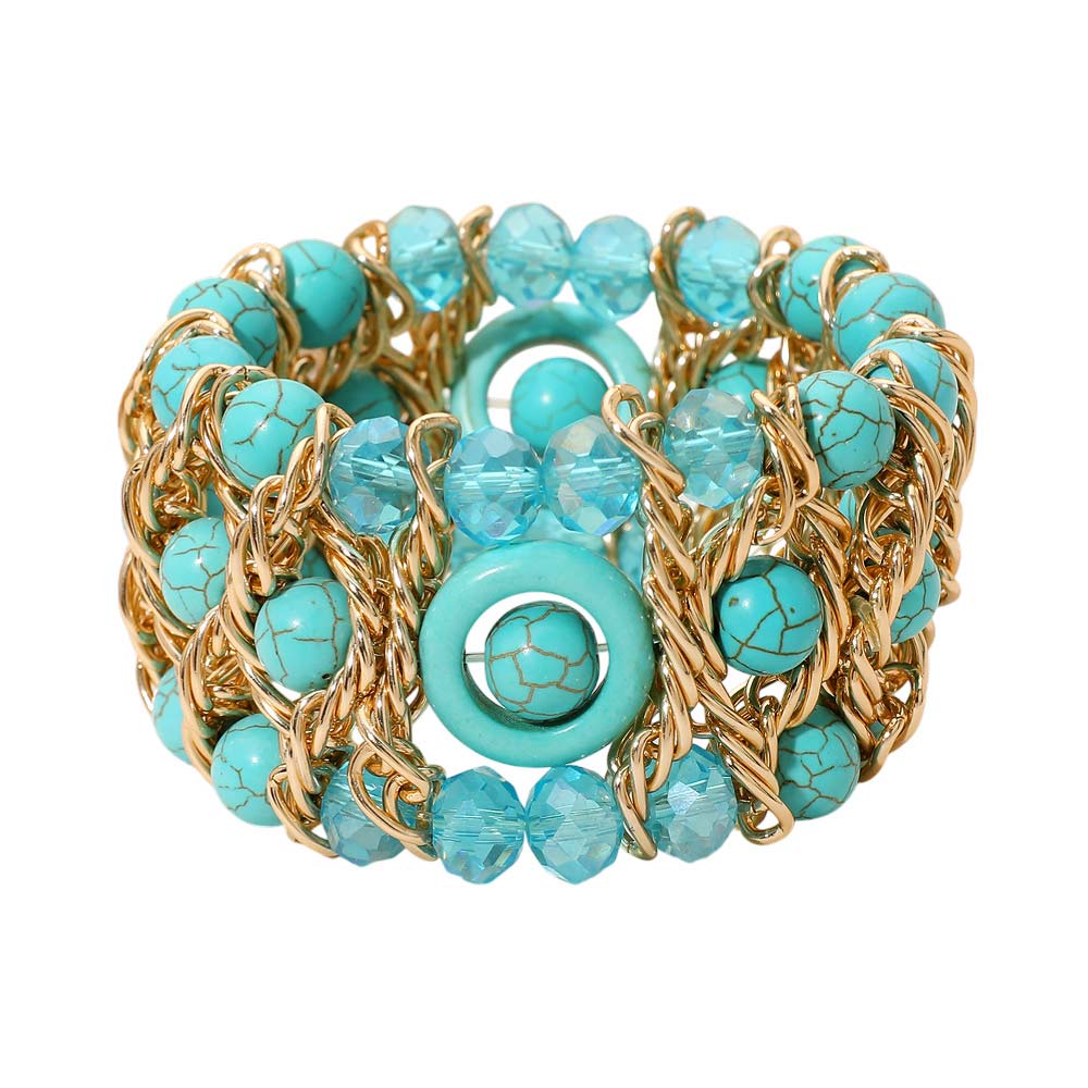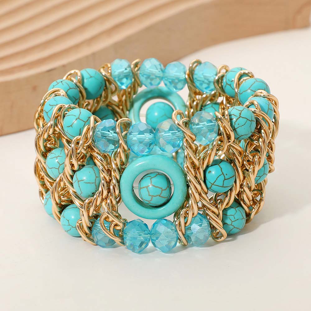 • Bold stretch bracelet designed with layered beads, faceted accents, and interlinked chain details for a dimensional statement look. Comfortable elastic fit allows easy wear while adding texture and shine to everyday or evening styling. Ideal for boutique collections, gifting, event styling, and trend-focused accessory assortments seeking eye-catching yet wearable designs.