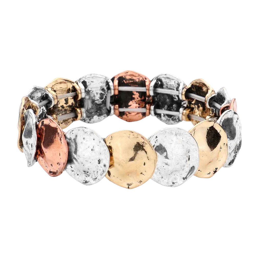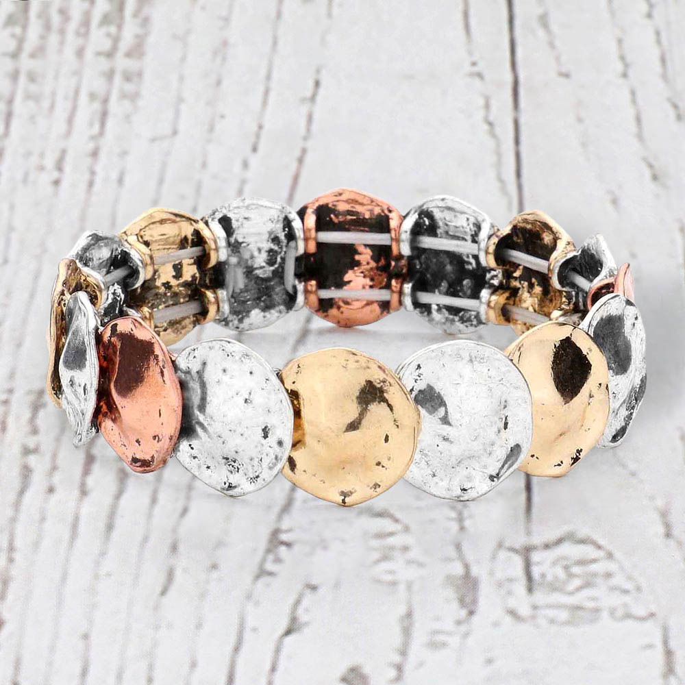 • Boho-inspired stretch bracelet featuring textured disc links in a mixed tone finish, offering a handcrafted and artistic look. Perfect for adding unique character to layered bracelet stacks or wearing solo as a standout accessory with creative flair.