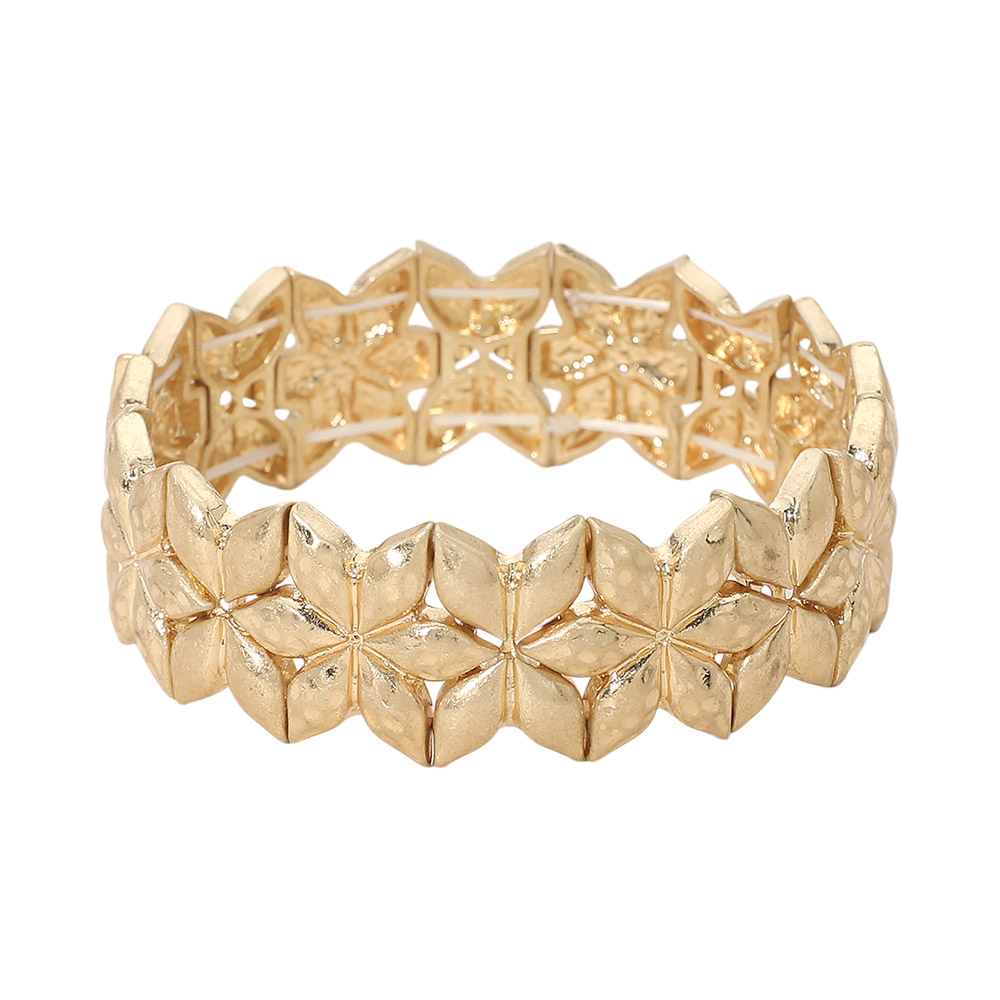 • Statement stretch bracelet designed with repeating geometric floral-inspired links that create bold dimension and texture. Features a flexible slip-on fit for easy wear and comfort. Ideal for stacking or wearing alone, this bracelet elevates everyday looks while adding sculptural detail and modern elegance.