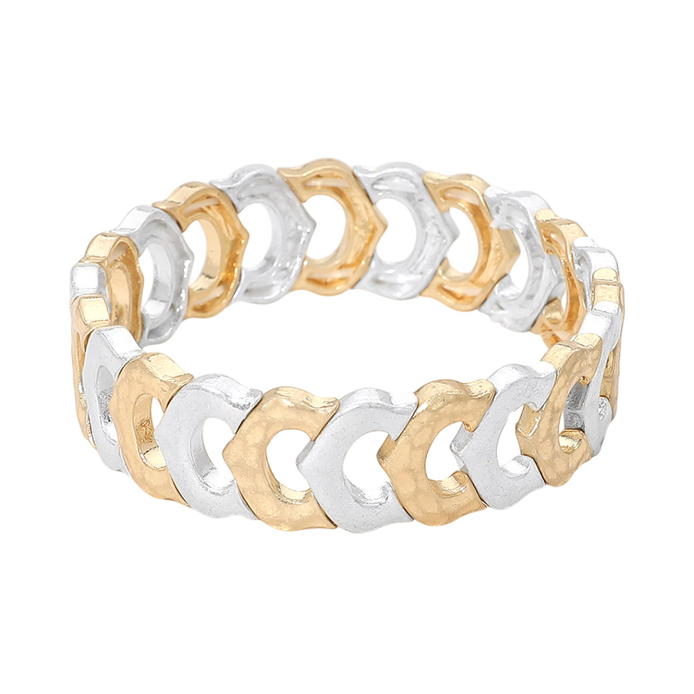 Details • Size : 0.6" H • Stretchable • Bold stretch bracelet featuring repeating links that create a sculptural, modern look. Designed with a flexible slip-on fit for comfort and easy wear. Perfect for stacking or wearing solo, this statement bracelet adds texture, movement, and contemporary edge to everyday outfits or elevated styling. • Lead and Nickel Compliant