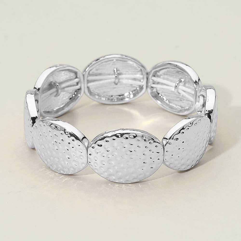 Details • Size : 0.75" H • Stretchable • This hammered oval stretch bracelet features softly textured oval links that add dimension and visual interest to a classic silhouette. Designed with a comfortable stretch fit, it offers easy wear and a refined statement look. Ideal for everyday styling, layering, boutique assortments, and gift-ready jewelry collections. • Lead and Nickel Compliant