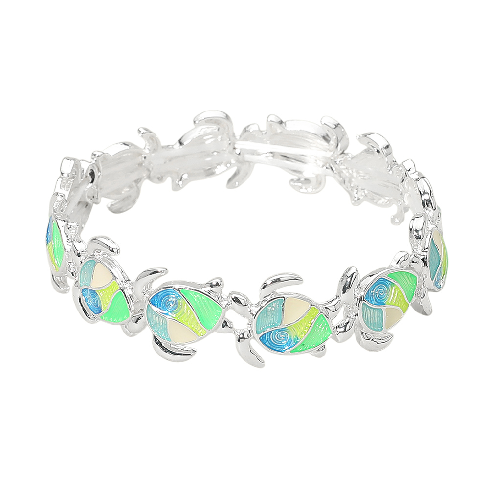 Details • Size : 0.75" H, 2.25" D • Stretchable • Sea turtle stretch bracelet featuring repeating turtle motifs with smooth linked detailing for a playful yet polished look. Designed for easy wear and everyday styling, this bracelet adds a coastal-inspired accent to casual outfits, vacation assortments, or gift-ready collections. A great choice for boutiques seeking charming, trend-forward accessories with broad customer appeal. • Lead and Nickel Compliant