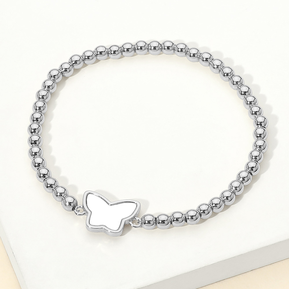 Details • Size : 0.4" H • Stretchable • This stretch bracelet features smooth rounded beads accented with a delicate butterfly charm for a graceful, symbolic look. Designed for easy slip-on wear and everyday comfort, it offers a balanced blend of charm and simplicity. Ideal for gifting, seasonal assortments, or daily styling, this bracelet layers effortlessly or stands beautifully on its own while adding a soft, whimsical touch to any accessory collection. • Stainless Steel