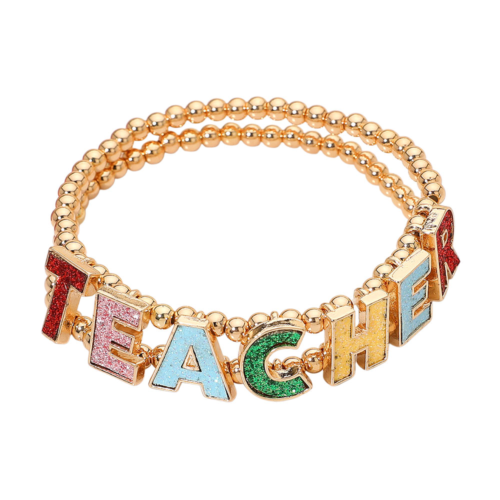 • A cheerful bracelet featuring bold letter charms spelling “TEACHER” on a stretch-bead design that slips on easily for everyday wear. Perfect as a thoughtful gift for educators, classroom celebrations, appreciation events, or casual accessorizing.