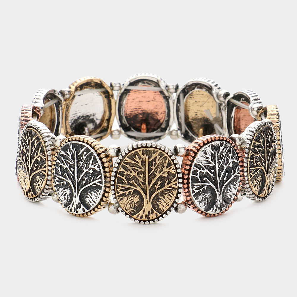 Stainless Steel Tree of Life Embossed Mother of Pearl Oval Charm Beaded Stretch Bracelet