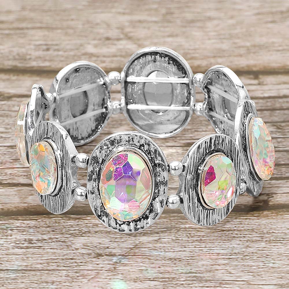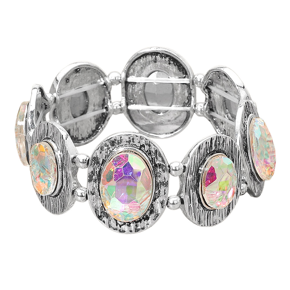 Details • Size : 1.1" H • Stretchable • This elegant stretch bracelet showcases oval-cut crystals set in textured vintage-inspired frames, adding brilliance and charm to any outfit. Comfortable and easy to wear, it pairs beautifully with both casual and evening looks, offering a perfect balance of sparkle and sophistication. • Lead and Nickel Compliant