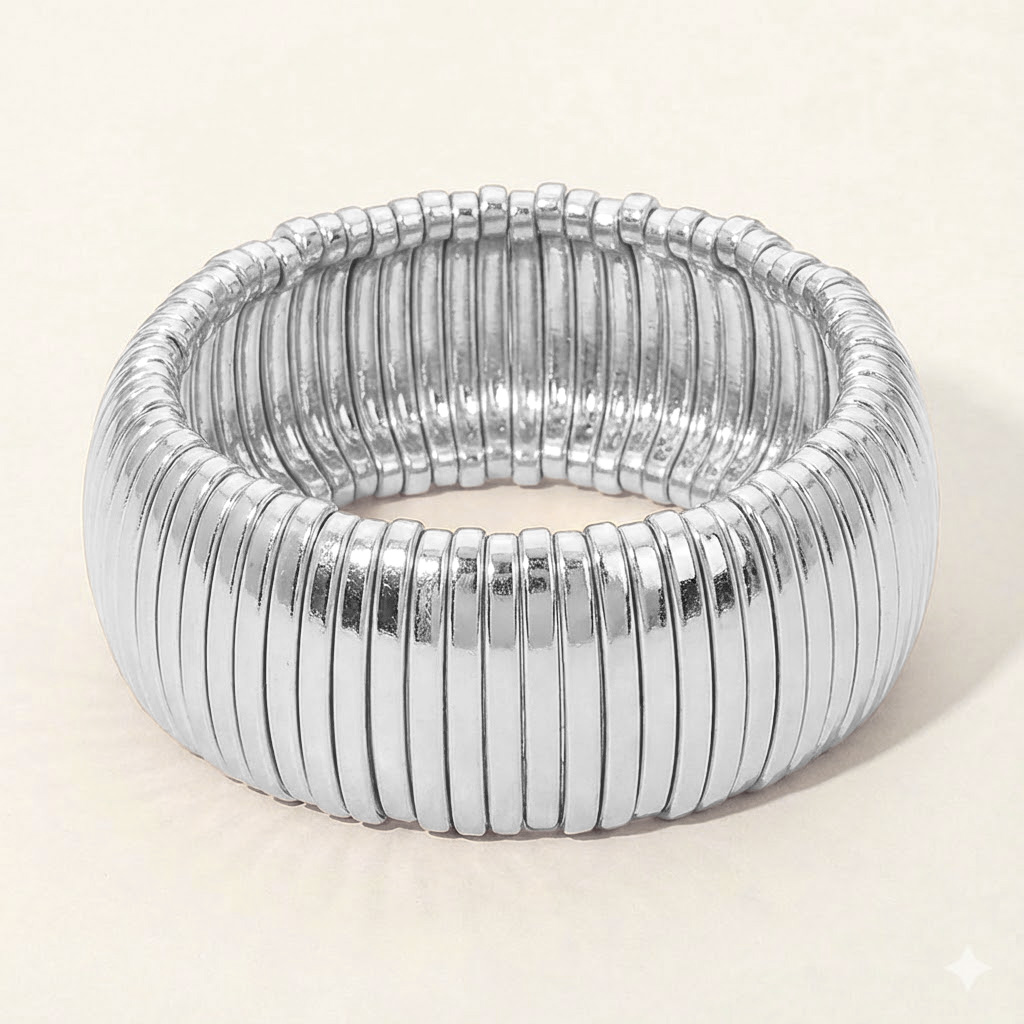 • This wide ribbed stretch bracelet features a sculpted, high-impact silhouette designed to stand out with clean lines and bold texture. Easy to slip on and comfortable for all-day wear, it’s ideal for boutiques seeking modern statement accessories that layer effortlessly and elevate everyday and fashion-forward looks.