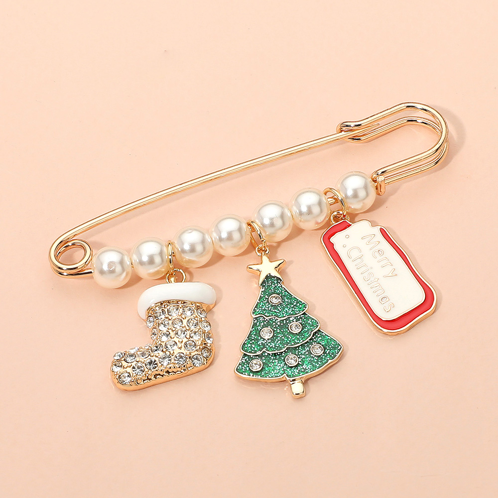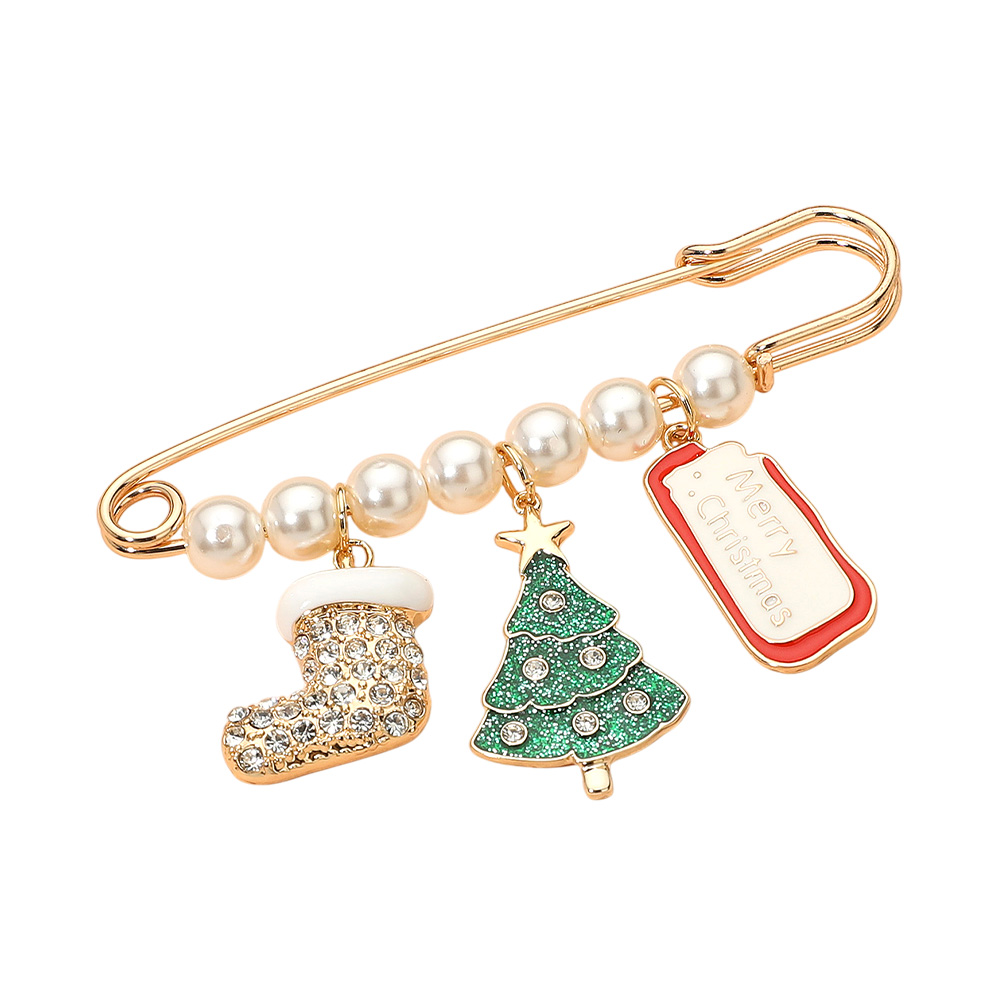 Details • Size : 3.25" X 0.7" • Charm Size : 1.4" L • Pin Brooch • Spread holiday cheer with this festive brooch featuring sparkling stocking, Christmas tree, and Merry Christmas charm details. Accented with elegant beads, this joyful accessory is perfect for pinning on coats, scarves, or bags to add a merry touch to any seasonal look.