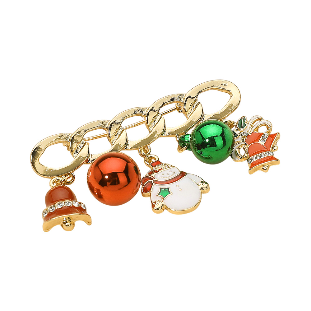 Details • Size : 2.5" X 0.4" • Charm Size : 1" L • Pin Brooch • Celebrate the season in style with this holiday brooch featuring festive charms including a snowman, ornaments, and bells. Designed with a secure clasp, this cheerful accessory adds a joyful touch to coats, scarves, or bags, making it a perfect piece for holiday outfits.