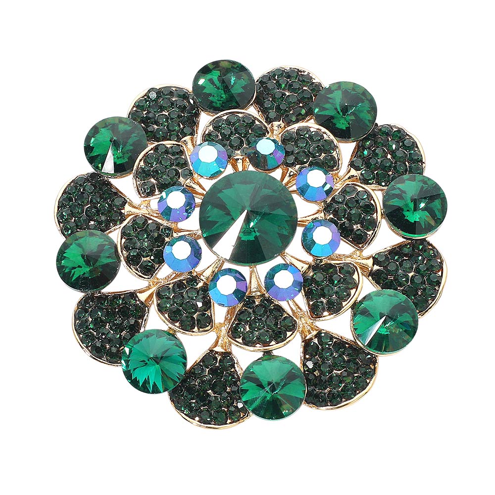 • This stunning round crystal flower brooch features layered gem accents that create a dazzling floral design. Perfect for elevating any outfit, it adds a touch of vintage-inspired glamour and refined brilliance to jackets, scarves, or formal attire.