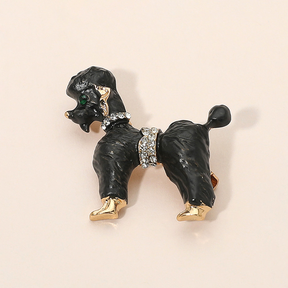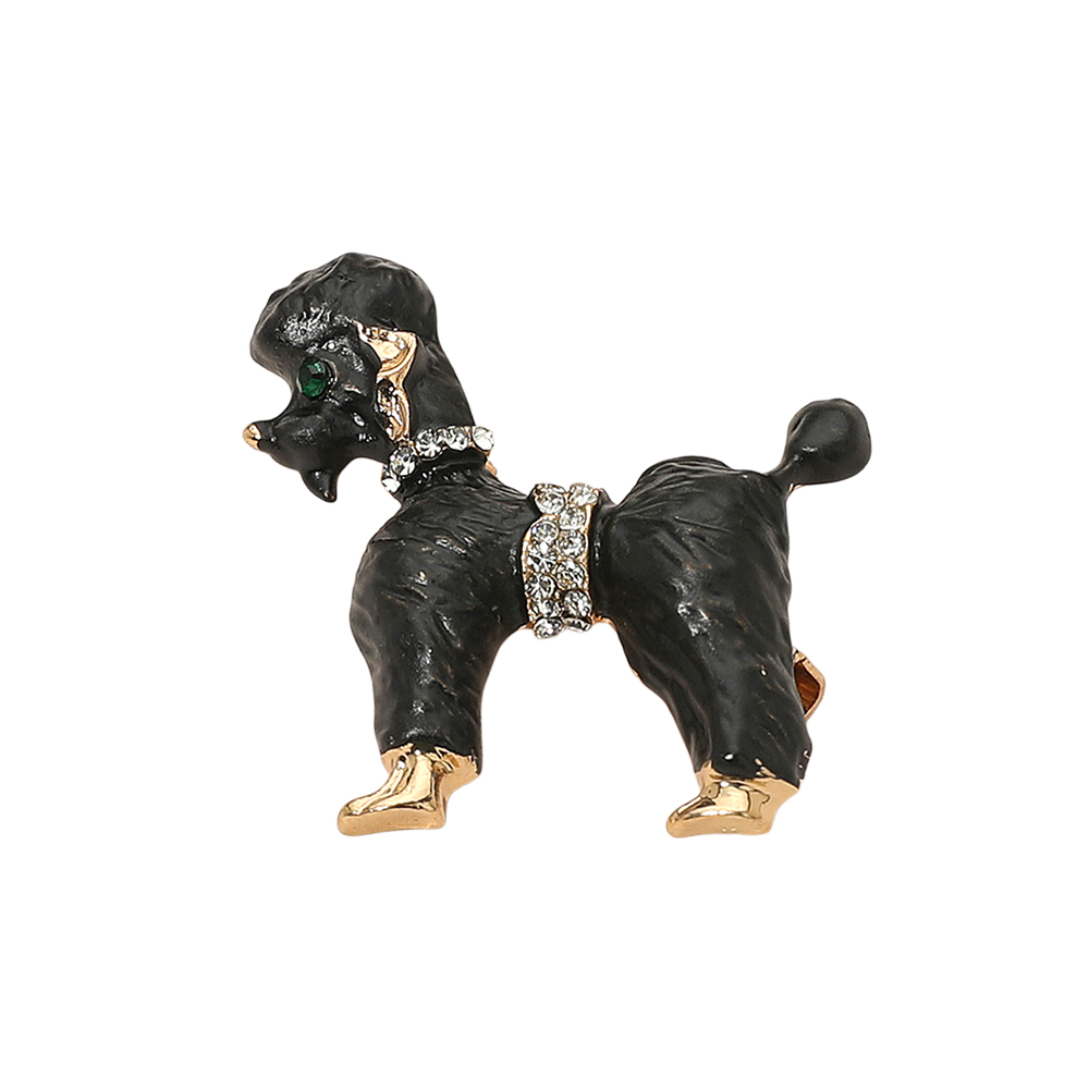 Details • Size : 1.3" X 1.4" • Pin Brooch • Charming poodle brooch adorned with sparkling crystal collar and waist accents, detailed enamel finish, and gold-toned highlights. A delightful accessory for dog lovers, this brooch adds sophistication to jackets, scarves, or handbags while showcasing a love for pets and elegant fashion flair. • Gold Dipped • Lead and Nickel Compliant
