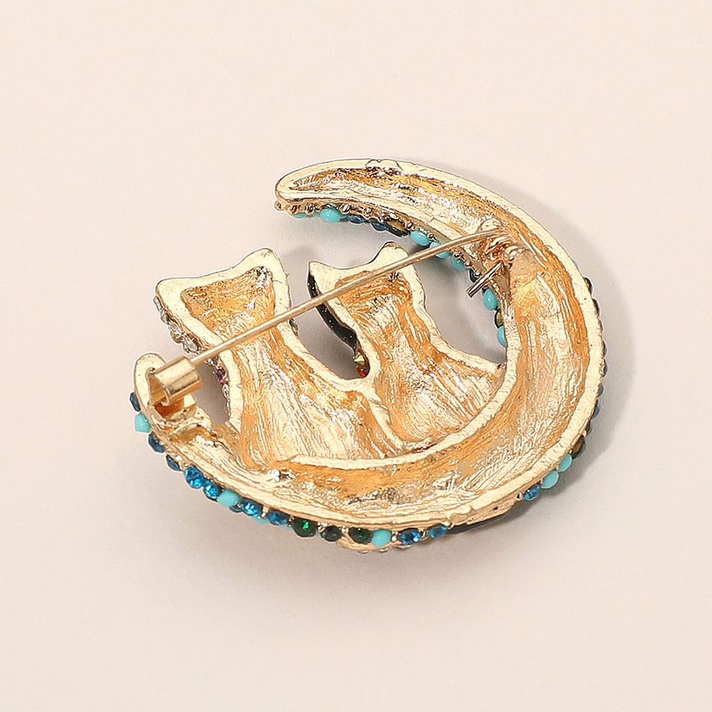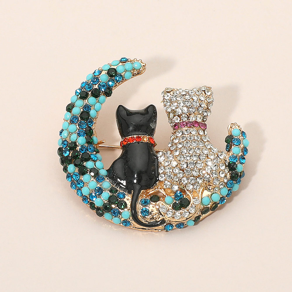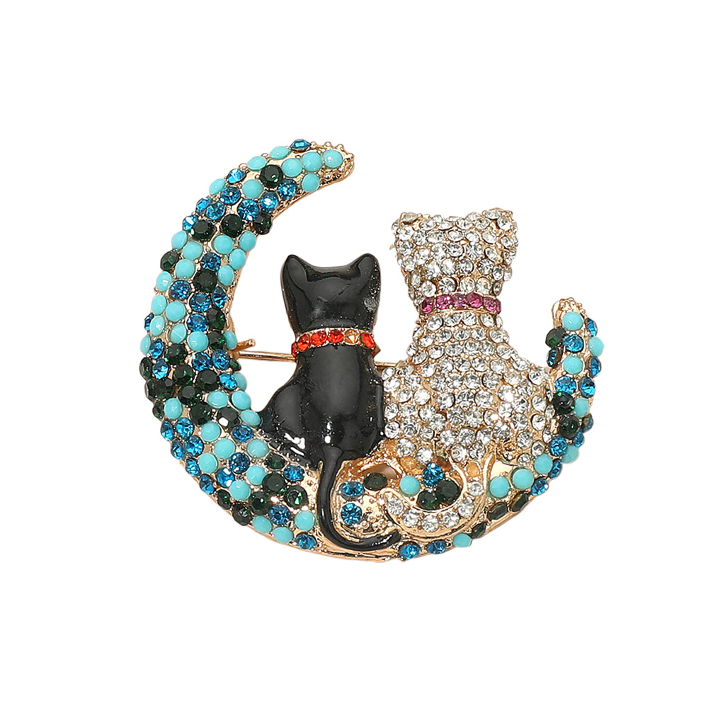 Details • Size : 1.75" X 1.75" • Pin Brooch • Charming cat and moon brooch adorned with dazzling crystals, featuring two cats sitting together on a crescent moon. A whimsical accessory that adds sparkle and personality to any outfit, perfect for animal lovers, collectors, or as a thoughtful gift with symbolic meaning. • Gold Dipped • Lead and Nickel Compliant