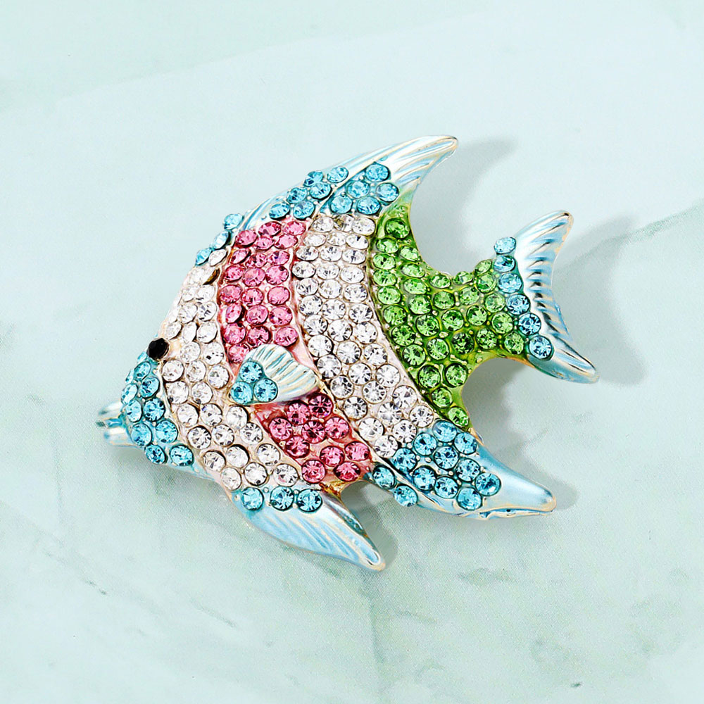 • Vibrant fish brooch adorned with sparkling rhinestones in a playful aquatic design. Perfect for adding a lively marine-themed accent to jackets, blouses, or bags with whimsical charm.