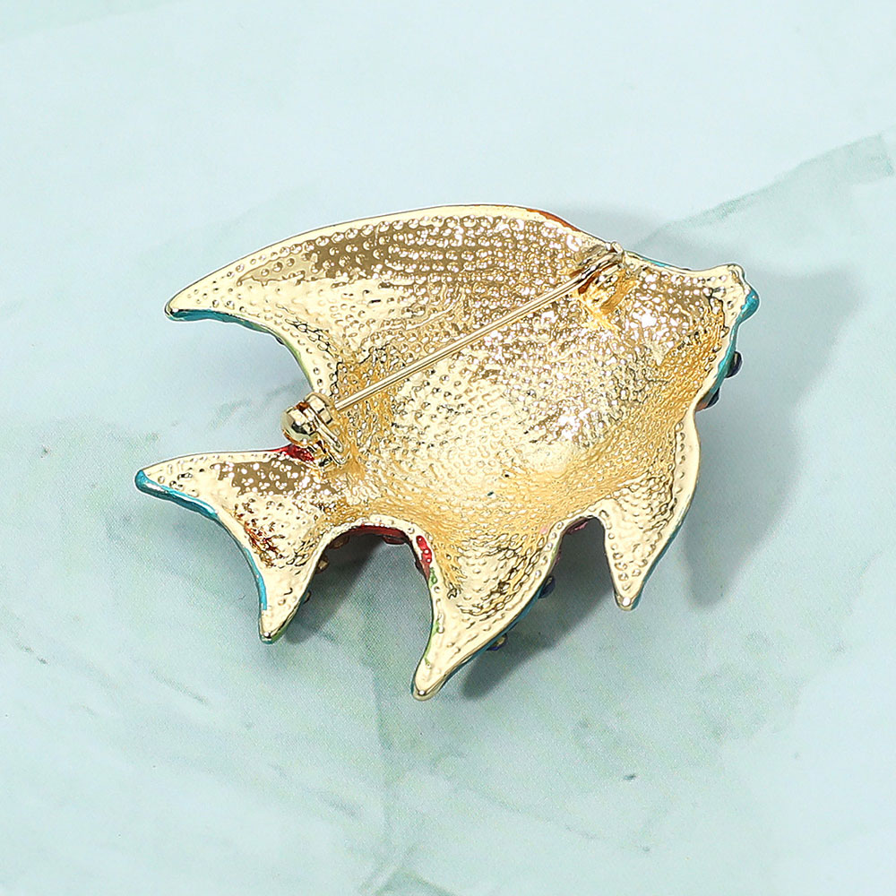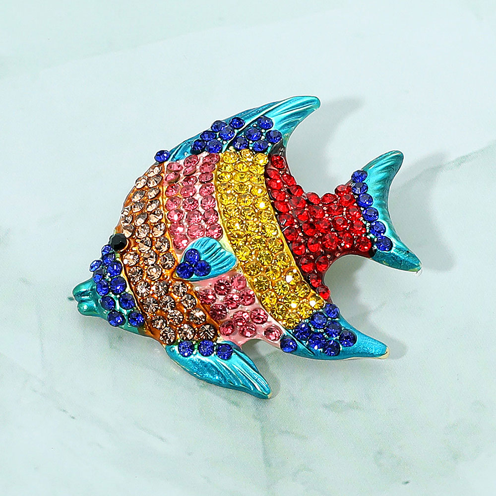 • Vibrant fish brooch adorned with sparkling rhinestones in a playful aquatic design. Perfect for adding a lively marine-themed accent to jackets, blouses, or bags with whimsical charm.