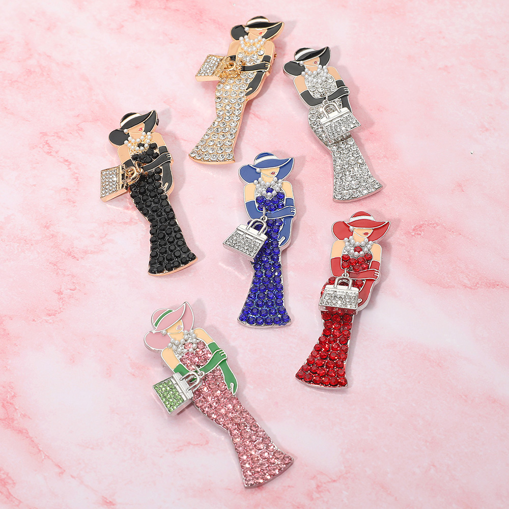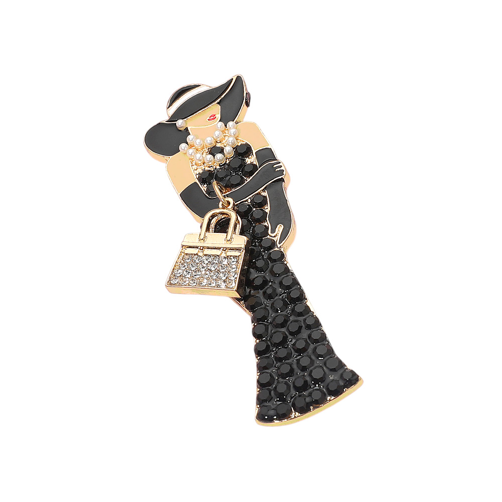 Details • Size : 1" X 3.1" • Pin Brooch • Chic lady brooch featuring a stylish dress, pearl necklace, and sparkling handbag detail. A fashionable accessory that adds charm to jackets, scarves, hats, or bags, perfect for gifting or personal style. • Lead and Nickel Compliant