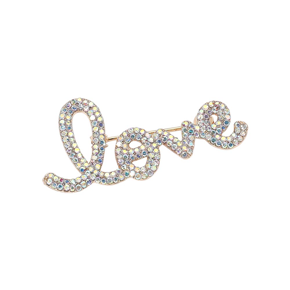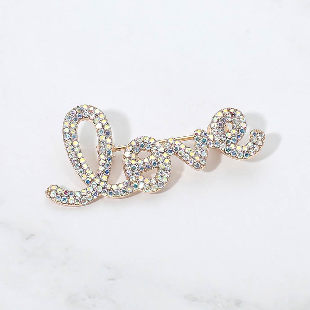 Details • Size : 2.2" X 0.9" • Pin Brooch • Stylish script love brooch featuring sparkling crystal accents for a meaningful statement look. Ideal for adding charm to jackets, dresses, scarves, hats, or bags, this versatile accessory brings a romantic touch to everyday outfits and special occasion styling. • Lead and Nickel Compliant