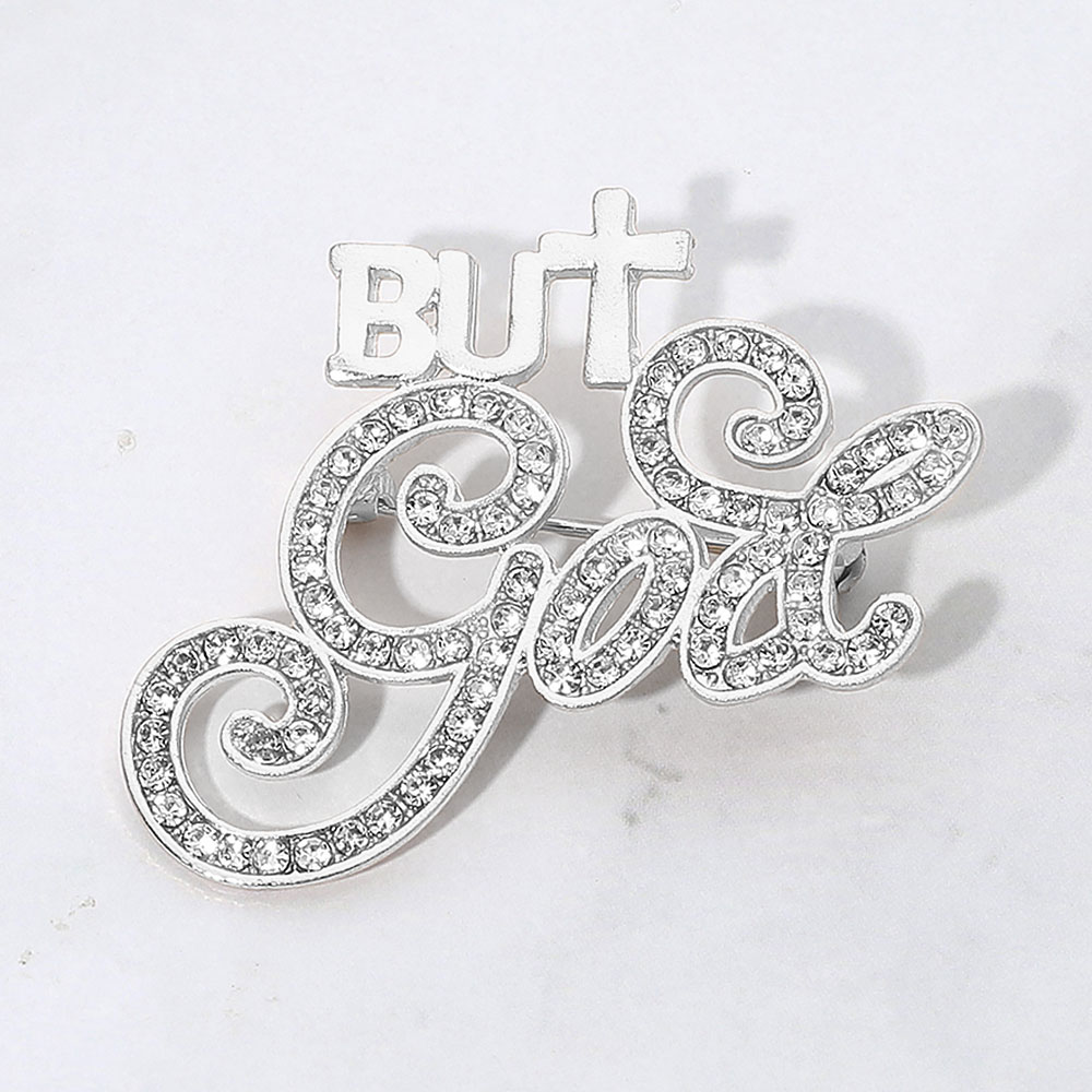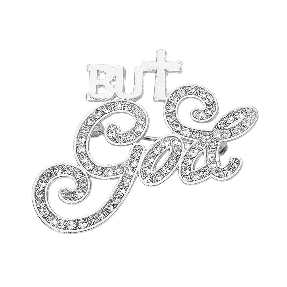 Details • Size : 1.9" X 1.7" • Pin Brooch • Faith-inspired brooch featuring the uplifting phrase “But God” in sparkling crystal detail. This elegant accessory adds a meaningful touch to any outfit, symbolizing hope and grace while enhancing your look with refined shine and spiritual charm. • Lead and Nickel Compliant
