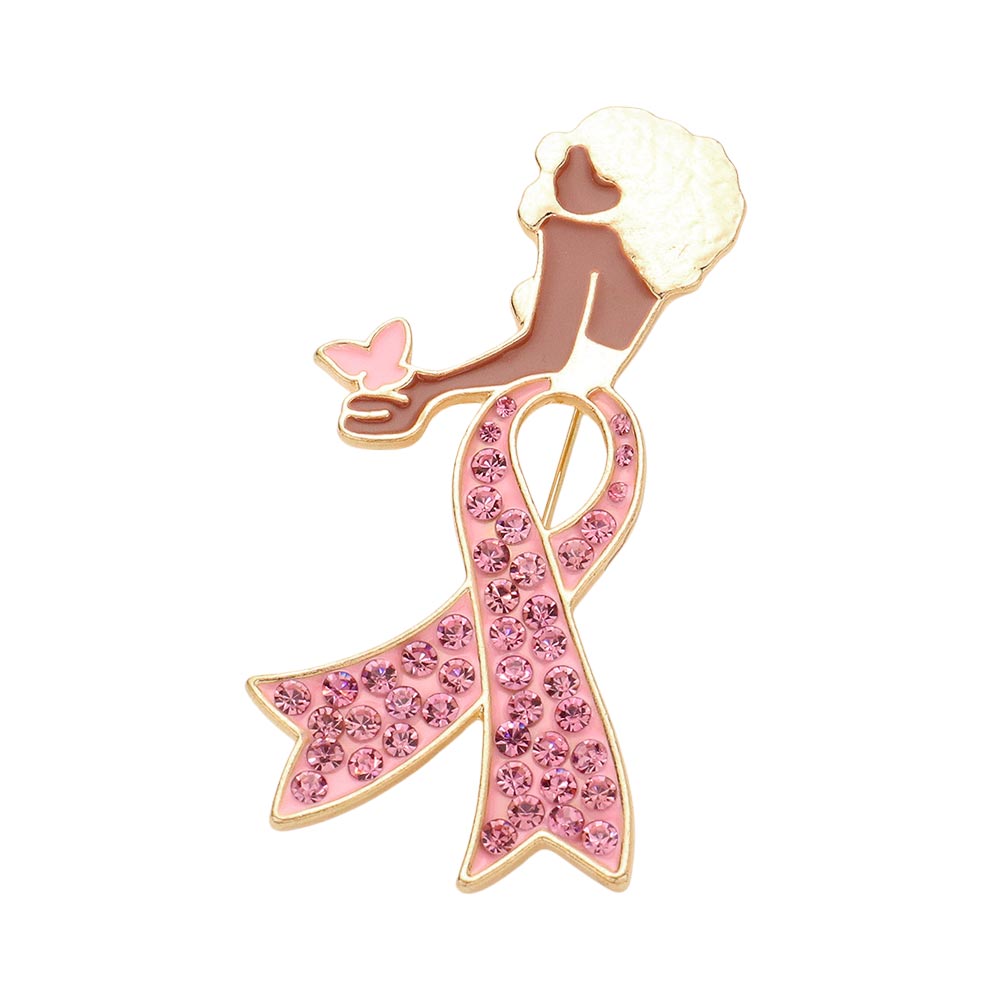 Details • Size : 1.25" X 2.5" • Pin Brooch • This empowering ribbon brooch features a radiant female figure holding a butterfly, beautifully paired with a sparkling awareness ribbon. A meaningful symbol of strength, hope, and transformation—perfect for honoring journeys, spreading awareness, and making a heartfelt statement. • Lead and Nickel Compliant