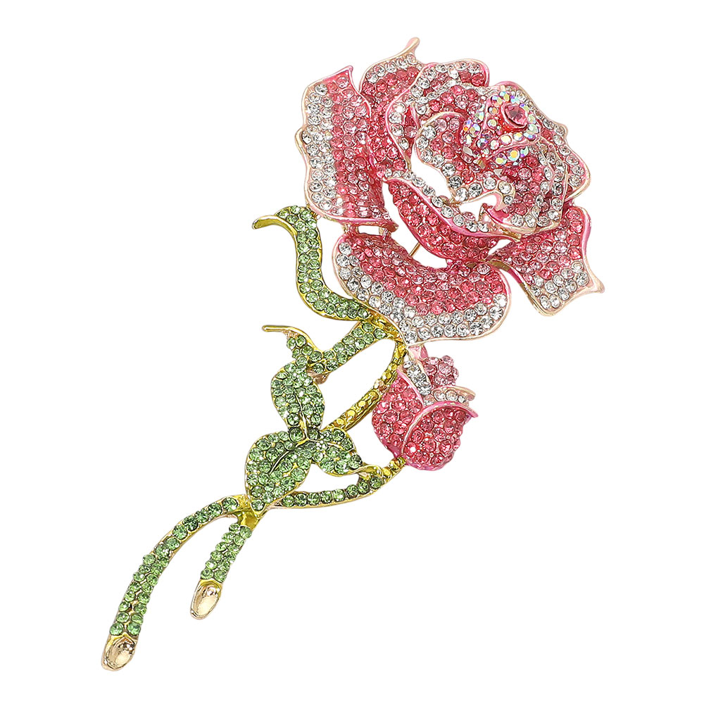 Bold Elegant Rhinestone Rose Stem Pin Brooch