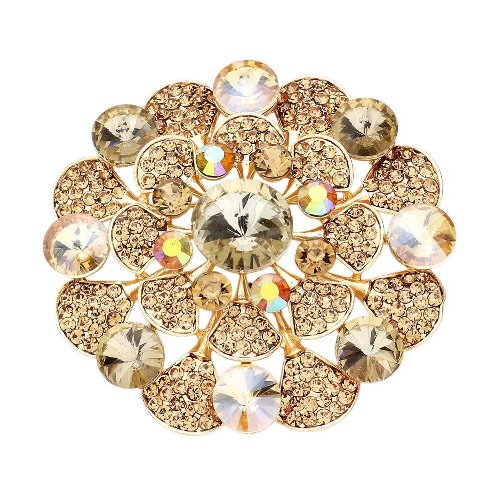 • This stunning round crystal flower brooch features layered gem accents that create a dazzling floral design. Perfect for elevating any outfit, it adds a touch of vintage-inspired glamour and refined brilliance to jackets, scarves, or formal attire.