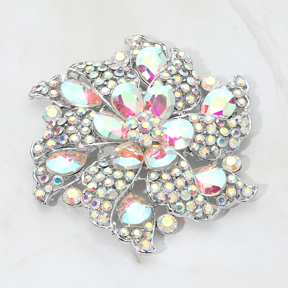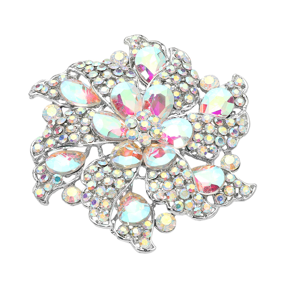 Details • Size : 4" X 4" • Pin Brooch • Elegant floral brooch featuring dazzling gemstone accents arranged in a radiant petal design. Perfect for adding a touch of glamour to jackets, dresses, or scarves, this statement accessory enhances any outfit with a refined and eye-catching sparkle. • Lead and Nickel Compliant