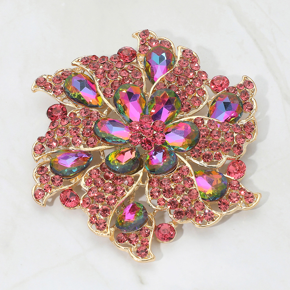 Details • Size : 4" X 4" • Pin Brooch • Elegant floral brooch featuring dazzling gemstone accents arranged in a radiant petal design. Perfect for adding a touch of glamour to jackets, dresses, or scarves, this statement accessory enhances any outfit with a refined and eye-catching sparkle. • Lead and Nickel Compliant